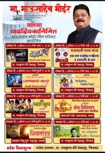 या कार्यक्रमांतर्गत शनिवारी ३ ऑगस्टला चिंचवड येथील प्रा. रामकृष्ण मोरे प्रेक्षागृहात ‘बाघमाऱ्या’ या खान्देशी ऐरणी या नाटकाचा प्रयोग संध्याकाळी ५ वाजून 30 मिनिटांनी होणार आहे. तर रात्री ९ वाजता ‘एक शाम भोलेनाथ के नाम’ हा राजस्थानी भजन संध्येचा कार्यक्रम होईल.