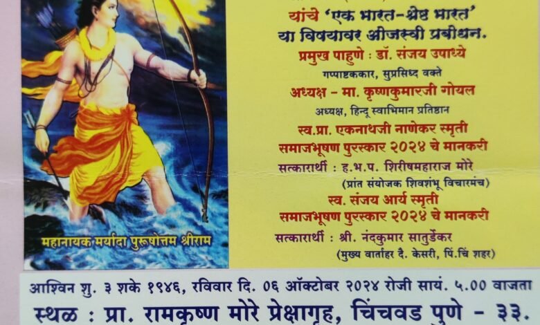 या कार्यक्रमात सर्वोच्च न्यायालयाचे वकील ॲड. अश्विनी कुमार उपाध्याय (नवी दिल्ली) यांचे ‘एक भारत – श्रेष्ठ भारत’ या विषयावर प्रबोधन पर व्याख्यान होईल. प्रमुख पाहुणे म्हणून गप्पाष्टककार डॉ. संजय उपाध्ये उपस्थित राहणार आहेत, तर कार्यक्रमाचे अध्यक्षस्थान हिंदू स्वाभिमान प्रतिष्ठानचे अध्यक्ष कृष्णकुमार गोयल भूषवणार आहेत.