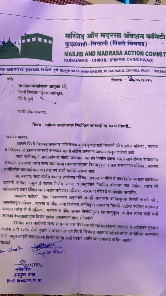 पिंपरी, पुणे (दि. १३ मे २०२५) पिंपरी चिंचवड महानगरपालिकेने कुदळवाडी, चिखली परिसरातील अनधिकृत मंदिर, मस्जिद, मदरसा व इतर धार्मिक स्थळांना अतिक्रमण बाबत नोटीस दिली आहे. या बाबत मदरसा, मस्जिद ॲक्शन कमिटीच्या वतीने आक्षेप घेण्यात आला होता. तसे पत्र समन्वयक राहुल डंबाळे आणि प्रतिनिधींनी आयुक्त शेखर सिंह यांना दिले होते. याविषयी मंगळवारी (दि.१३) आयुक्त शेखर सिंह यांच्या दालनामध्ये बैठक आयोजित करण्यात आली होती. मा. सर्वोच्च न्यायालय व राज्य सरकारच्या मार्गदर्शक सूचनांचे पालन मनपाने करावे. तसेच आक्षेप घेण्यात आलेल्या व प्राप्त झालेल्या पत्रांवर सुनावणी घेण्यात यावी अशी मागणी यावेळी आयुक्तांकडे करण्यात आली.