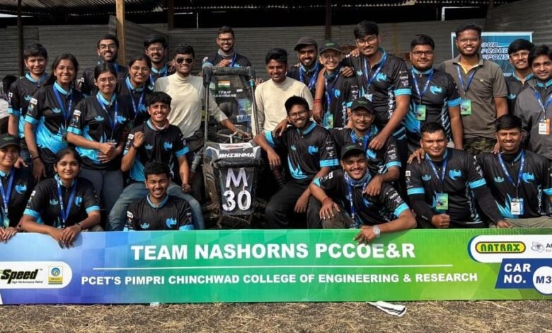 पिंपरी, पुणे (दि. १६ जानेवारी २०२५) सोसायटी ऑफ ऑटोमोटिव्ह इंजिनियर्स यांच्या वतीने आयोजित केलेल्या एसएई इंडिया एम-बाहा २०२५ या राष्ट्रीय स्पर्धेत रावेत येथील पिंपरी चिंचवड एज्युकेशन ट्रस्ट (पीसीईटी) च्या पिंपरी चिंचवड कॉलेज ऑफ इंजिनियरिंग अँड रिसर्च (पीसीसीओईआर) मधील मेकॅनिकल विभागातील “टीम नॅशोर्न्सने” एकूण अकरा पदकांची कमाई करत भारतात प्रथम क्रमांक मिळवला. या स्पर्धेत देशभरातील पन्नासहून अधिक नामांकित अभियांत्रिकी महाविद्यालयांनी सहभाग घेतला होता. स्पर्धेच्या १७ व्या आवृत्तीत आयोजकांनी ट्रॅकमध्ये बदल केला होता आणि त्यात नवीन बिट समाविष्ट केले होते. टीम नॅशोर्न्सने ड्युरेबिलिटी, फिझीकल डायनॅमिक्स, स्टॅटिक इन्फॉर्मेशन, प्रोडक्शन कॉस्ट, मॅन्युव्हरेबिलिटी, डिझाइन, व्हॅलीडेशन अशा ७ विविध विभागात प्रथम क्रमांक व सस्पेन्शन व ट्रॅक्शन, व्हर्च्युअल डायनॅमिक, ऍक्सलरेशन अशा ३ विभागात द्वितीय क्रमांक आणि प्रा. सुखदिप चौगुले यांना द्रोणाचार्य परितोषिक अशा वेगवेगळ्या कसोट्यांमध्ये उज्ज्वल यश संपादन भारतात प्रथम क्रमांक मिळवून या स्पर्धेत २ लाख ७५ हजार रुपयांची पारितोषिके मिळवली. मध्यप्रदेशातील पिथमपूर येथे या राष्ट्रीय स्पर्धा आयोजित करण्यात आल्या होत्या.