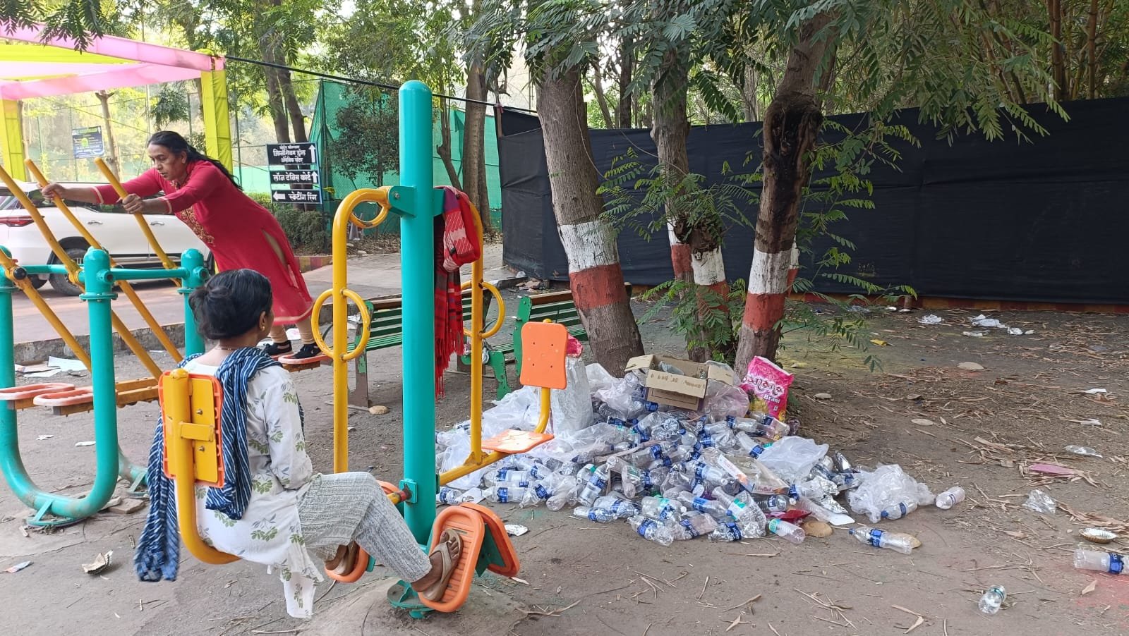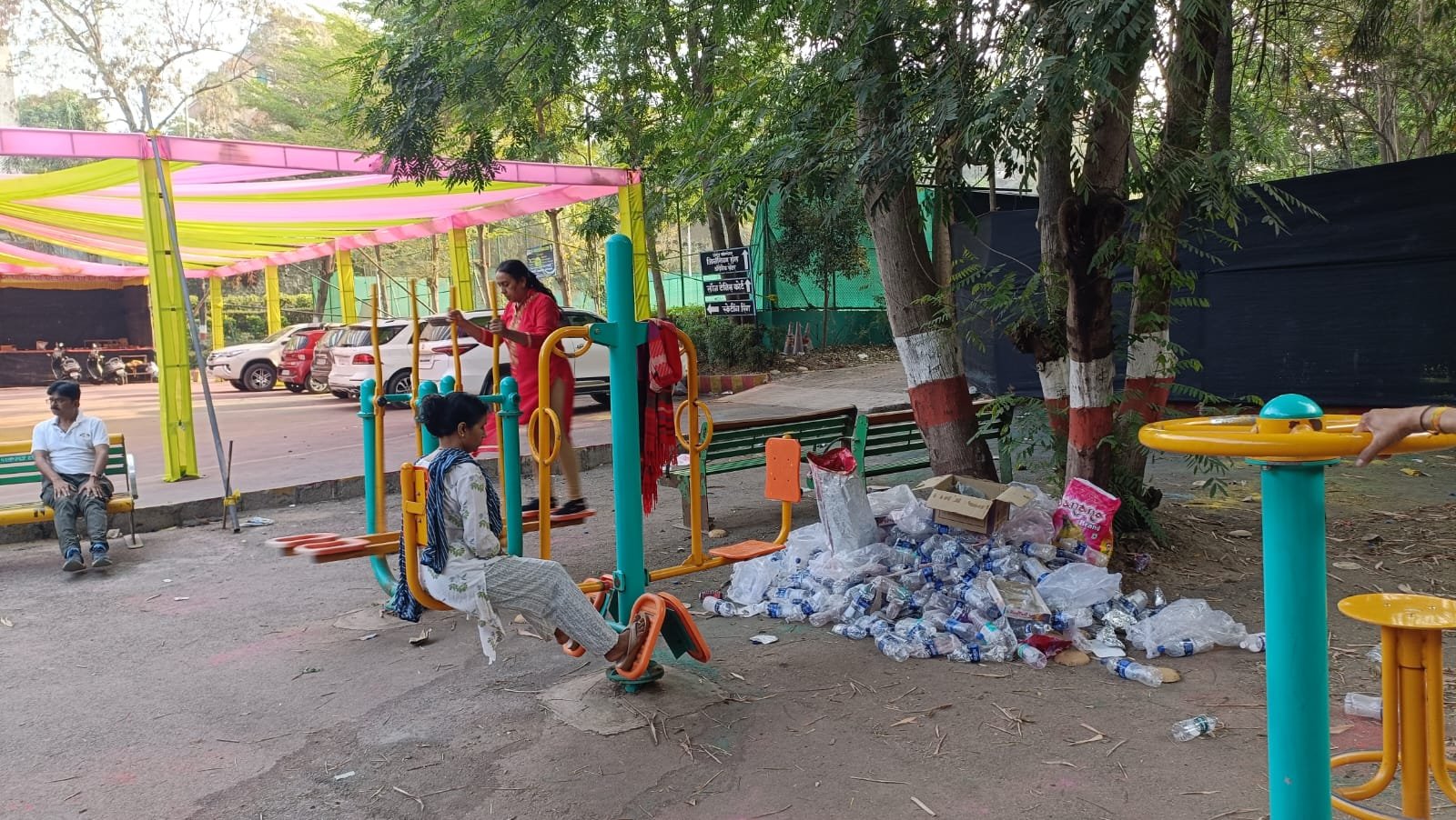 शुक्रवारी धुलीवंदन सणाच्या निमित्ताने प्राधिकरणातील भाजपच्या दोन पदाधिकाऱ्यांनी या उद्यानातील पटांगणात रंगोत्सव कार्यक्रमाचे आयोजन केले. या कार्यक्रमांमध्ये अल्पोपहार देण्यासाठी वापरलेल्या डिश आणि पाण्याच्या बिसलेरी बाटल्या व्यायामासाठी लावलेल्या साहित्याच्या ठिकाणी तशाच टाकून देण्यात आल्या.