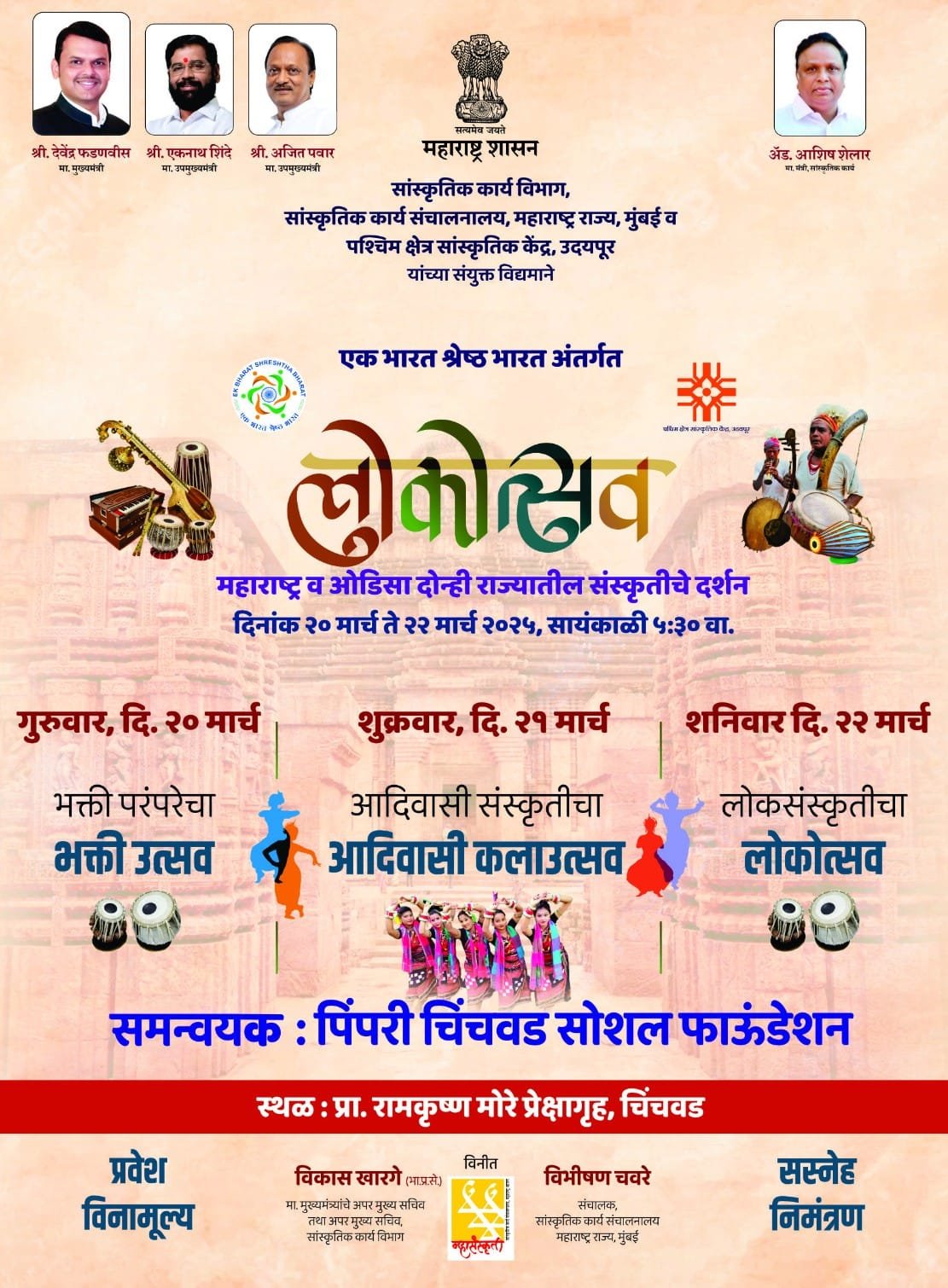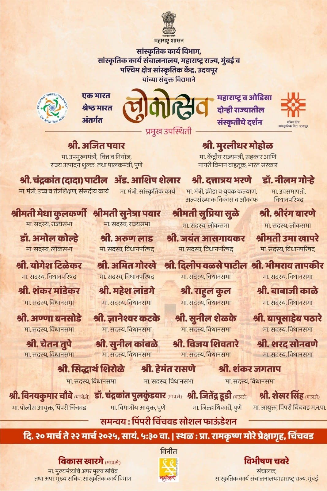 पिंपरी, पुणे ( दि. १९ मार्च २०२५) महाराष्ट्र शासनाच्या सांस्कृतिक कार्य विभाग, सांस्कृतिक कार्य संचालनालय व पश्चिम क्षेत्र सांस्कृतिक केंद्र उदयपूर यांच्या संयुक्त विद्यमाने एक भारत श्रेष्ठ भारत अंतर्गत महाराष्ट्र व ओडिसा या राज्यातील संस्कृतीचे दर्शन घडवणारा “लोकोत्सव” चे उद्घाटन गुरुवारी (दि. २०) उपमुख्यमंत्री अजित पवार व केंद्रीय नागरी विमान वाहतूक राज्यमंत्री यांच्या प्रमुख उपस्थितीत सायंकाळी ५ होणार आहे अशी माहिती या कार्यक्रमाचे समन्वयक पिंपरी चिंचवड सोशल फाउंडेशनचे प्रवीण तुपे यांनी प्रसिद्धीस दिली आहे.