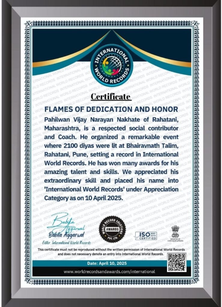गुरुवारी (दि. १० एप्रिल ) रहाटणी, ता. हवेली, जि. पुणे येथील भैरवनाथ तालीम येथे पै. विजय नारायण नखाते यांच्या नेतृत्वाखाली आखाड्यामध्ये एकाच वेळी २१०० तेलाचे दिवे प्रज्वलित करून जागतिक विक्रम करण्यात आला. या विक्रमाची नोंद “इंटरनॅशनल वर्ल्ड रेकॉर्ड” मध्ये घेण्यात आली. त्याचे प्रमाणपत्र पद्मश्री मुरलीकांत पेटकर यांच्या हस्ते पै. विजय नखाते यांना देण्यात आले.