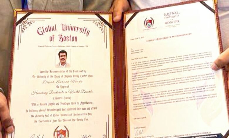 डॉ. दीपक हरके यांना अमेरिका, बोस्टन येथील ग्लोबल युनिव्हर्सिटीची ॲानररी डॅाक्टरेट