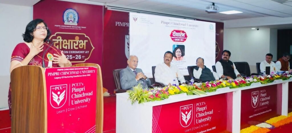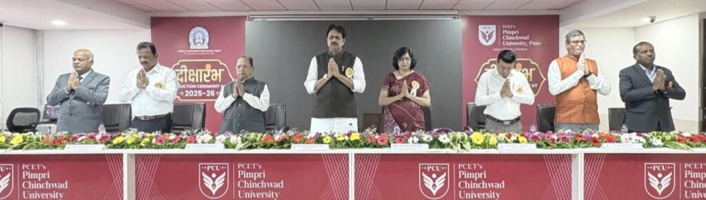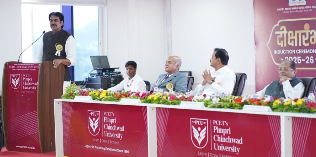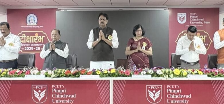 पिंपरी चिंचवड एज्युकेशन ट्रस्ट पीसीईटी संचालित पिंपरी चिंचवड विद्यापीठ, साते मावळ येथे शैक्षणिक वर्ष २०२५-२६ मध्ये प्रवेश घेतलेल्या विद्यार्थी आणि त्यांच्या पालकांसाठी ‘दीक्षारंभ’ समारंभाचे आयोजन सोमवारी (२५ ऑगस्ट) करण्यात आले होते. यावेळी पीसीईटीचे अध्यक्ष ज्ञानेश्वर लांडगे, विश्वस्त तथा पीसीयुचे कुलपती हर्षवर्धन पाटील, उद्योजक नरेंद्र लांडगे, धनंजय काळभोर, प्रभारी कुलगुरू डॉ. गोविंद कुलकर्णी, प्र-कुलगुरू डॉ. सुदीप थेपडे, स्कूल ऑफ इंजिनीअरिंग अँड टेक्नॉलॉजीचे विभाग प्रमुख डॉ. रामदास बिरादार, अभियांत्रिकी विभाग अधिष्ठाता डॉ. विजय पाटील आदी उपस्थित होते.