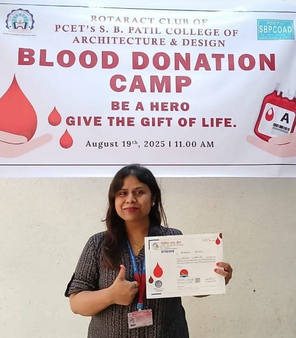 पिंपरी (दि. ०३ सप्टेंबर २०२५) रोट्रॅक्ट क्लब, पिंपरी चिंचवड एज्युकेशन ट्रस्ट (पीसीईटी) संचालित एस. बी. पाटील कॉलेज ऑफ आर्किटेक्चर अँड डिझाईन यांच्या वतीने नुकतेच पीसीईटी शैक्षणिक संकुलात रक्तदान शिबिराचे आयोजन करण्यात आले होते. यासाठी रोटरी क्लब ऑफ पुणे, लोकमान्यनगर व रोटरी क्लब ऑफ पिंपरी एलिट यांचे सहकार्य लाभले.
