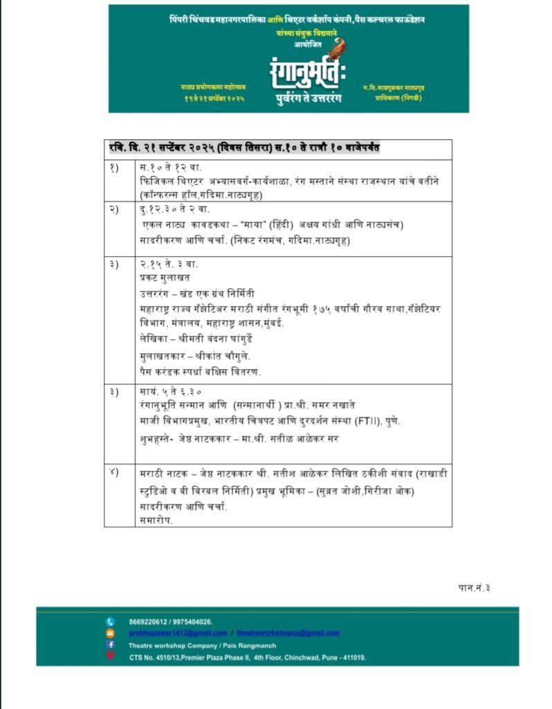 तत्पूर्वी सकाळी दहा वाजता नाट्यगृहातील कॉन्फरन्स हॉल येथे रंग मस्ताने संस्था राजस्थानच्या कलावंतांच्या वतीने “फिजिकल थिएटर” आयोजित अभ्यासवर्ग – कार्यशाळा होईल. दुपारी १२:३० वाजता गदिमा नाट्यगृहातील निकट रंगमंचवर राजस्थानच्या अक्षय गांधी आणि कलाकारांचे ” एकलनाट्य कावडकथा – “माया” या हिंदी भाषेतील नाटकाचे सादरीकरण आणि त्यावर चर्चासत्र होईल. दुपारी दोन वाजता, मराठी रंगभूमीची १७५ वर्षांच्या गौरव गाथा मांडणारा महाराष्ट्र राज्य गॅझेटिअर विभाग, मंत्रालय महाराष्ट्र शासन, मुंबईच्या वतीने निर्मित “उत्तररंग – एक खंड” च्या लेखिका वंदना घांगुर्डे यांची श्रीकांत चौगुले हे प्रकट मुलाखत घेणार आहेत.