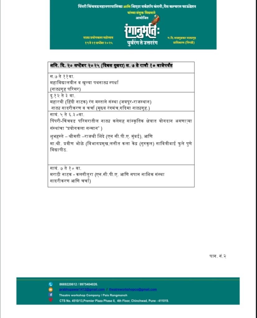 शनिवारी (दि. २० सप्टेंबर) सायंकाळी पाच वाजता, पिंपरी चिंचवड परिसरात नाट्यकलेसह सांस्कृतिक क्षेत्रात योगदान असणाऱ्या संस्थांचा “प्रयोगकला सन्मान” हा पुरस्कार देऊन गौरव करण्यात येणार आहे. यावेळी एनसीपीएच्या राजश्री शिंदे आणि सावित्रीबाई फुले पुणे विद्यापीठाचे ललित कला केंद्र, विभाग प्रमुख प्रवीण भोळे आदी प्रमुख पाहुणे उपस्थित राहणार आहेत. यानंतर सायंकाळी सात वाजता, एनसीपीए मुंबई आणि नाशिक येथील सपान संस्थेचे “कलगीतुरा” हे मराठी नाटक सादरीकरण आणि त्यावर चर्चासत्र होईल.