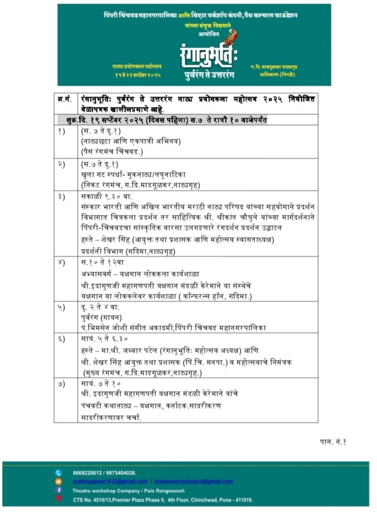 पिंपरी, पुणे (दि. १६ सप्टेंबर २०२५) पिंपरी चिंचवड महानगरपालिका आणि थिएटर वर्कशॉप कंपनी व पैस कल्चरल फाउंडेशन यांच्या संयुक्त विद्यमाने “रंगानुभूति: पूर्वरंग ते उत्तररंग नाट्य प्रयोग कला महोत्सव २०२५” चे आयोजन १९ ते २१ सप्टेंबर पर्यंत ग. दि. माडगूळकर नाट्यगृह, प्राधिकरण निगडी येथे करण्यात आले आहे. या महोत्सवाचे उद्घाटन शुक्रवारी (दि.१९) सायंकाळी पाच वाजता प्रसिद्ध चित्रपट निर्माते, दिग्दर्शक व महोत्सवाचे अध्यक्ष जब्बार पटेल हे असून, पिंपरी चिंचवड महानगरपालिका आयुक्त शेखर सिंह तथा प्रशासक आणि महोत्सवाचे निमंत्रक यांच्या शुभहस्ते होणार आहे. यानंतर सात वाजता कर्नाटक श्री. इदागुणजी महागणपती यक्षगान मंडळी केरेमाने कर्नाटक यांचे पंचवटी ही कथानाट्य असलेली – यक्षगान प्रयोगकला सादर होईल आणि सादरीकरणावर चर्चासत्र होईल अशी माहिती संयोजक व पैस रंगमंच चे संस्थापक प्रभाकर पवार यांनी मंगळवारी आयोजित केलेल्या पत्रकार परिषदेत दिली.