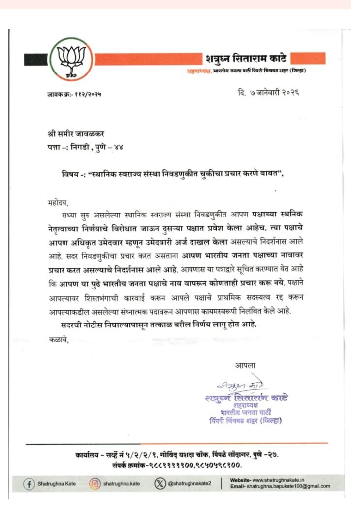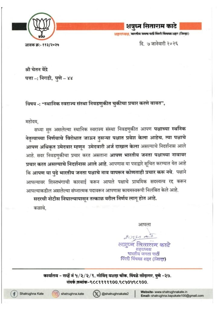 पिंपरी, पुणे (दि. ०७ जानेवारी २०२६) पिंपरी चिंचवड महानगरपालिका निवडणुकीच्या पार्श्वभूमीवर भारतीय जनता पक्षाने शिस्तभंग आणि चुकीच्या प्रचाराविरोधात कठोर भूमिका घेत प्रभाग क्रमांक १५ मधील चेतन बेंद्रे आणि समीर जावळकर यांची पक्षातून हकालपट्टी केली आहे. पक्षाच्या अधिकृत निर्णयाविरोधात जाऊन दुसऱ्या पक्षाची उमेदवारी स्वीकारणे, तसेच भाजपच्या नावावर चुकीचा प्रचार केल्याने ही कारवाई करण्यात आली असल्याची माहिती भाजपचे शहराध्यक्ष शत्रुघ्न सिताराम काटे यांनी प्रसिद्धीस दिली आहे.