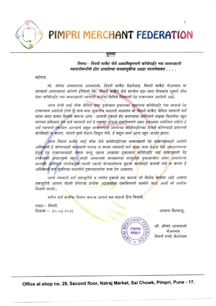 पिंपरी, पुणे (दि. ३० मार्च २०२६) पिंपरी कॅम्प मधील व्यापाऱ्यांना कॉपीराईट च्या नावाखाली धाड टाकण्यासाठी आलेले अधिकारी विनाकारण त्रास देतात. कोणत्याही कायद्याचे पालन न करता व्यापारी वर्गाकडून पैसे उकळण्याचा त्यांचा उद्देश असतो, असा प्रकार यापूर्वी तीन वेळा पिंपरी कॅम्प मध्ये घडलेला आहे. त्याची पुनरावृत्ती सोमवारी दुपारी होत होती, परंतु व्यापाऱ्यांच्या एकजुटीमुळे अधिकाऱ्यांना परत फिरावे लागले, व्यापाऱ्यांनी एकजुट दाखवावी व अशा बेकायदेशीर धाडी टाकणाऱ्या अधिकाऱ्यांविरुद्ध पुढे येऊन प्रतिकार करावा असे आवाहन पिंपरी मर्चंट फेडरेशनचे संस्थापक अध्यक्ष श्रीचंद आसवानी यांनी केले.