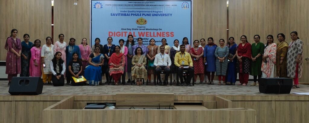 पिंपरी चिंचवड एज्युकेशन ट्रस्टच्या (पीसीइटी) रावेत येथील पिंपरी चिंचवड कॉलेज ऑफ इंजिनिअरिंग अँड रिसर्च (पीसीसीओइआर) कॉम्प्युटर इंजिनिअरिंग विभागातर्फे सावित्रीबाई फुले पुणे विद्यापीठ (एसपीपीयू) यांच्या गुणवत्ता सुधार योजने अंतर्गत “डिजिटल वेलनेस” या विषयावर एक दिवसीय राज्यस्तरीय कार्यशाळा आयोजित करण्यात आली होती. यावेळी प्रा. वृंदा आंबेकर, पीसीसीओईआरचे संचालक व प्राचार्य डॉ. हरीश तिवारी, उपसंचालक प्रा. डॉ. राहुल मापारी, अकॅडमिक डीन डॉ. अर्चना चौगुले, कॉम्प्युटर विभाग प्रमुख डॉ. विजय कोतकर, प्राध्यापक व विद्यार्थी आदी उपस्थित होते.